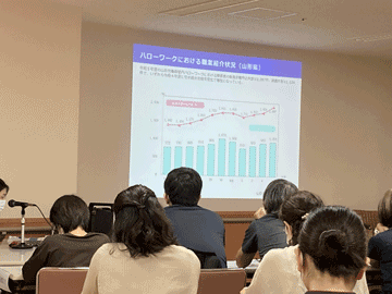 シンポジストに山形県障害者職業センター、ハローワーク専門援助部門、就労継続支援B型事業所こまくさの里よりお迎えし、当院からはデイケアセンターエスポワールのスタッフより、それぞれの機関の役割や実践報告がありました。その他、就労支援における「チーム支援」について、シンポジストの方々から関係機関同士の連携の重要性や、その効果について具体的な事例を通じて報告がありました。