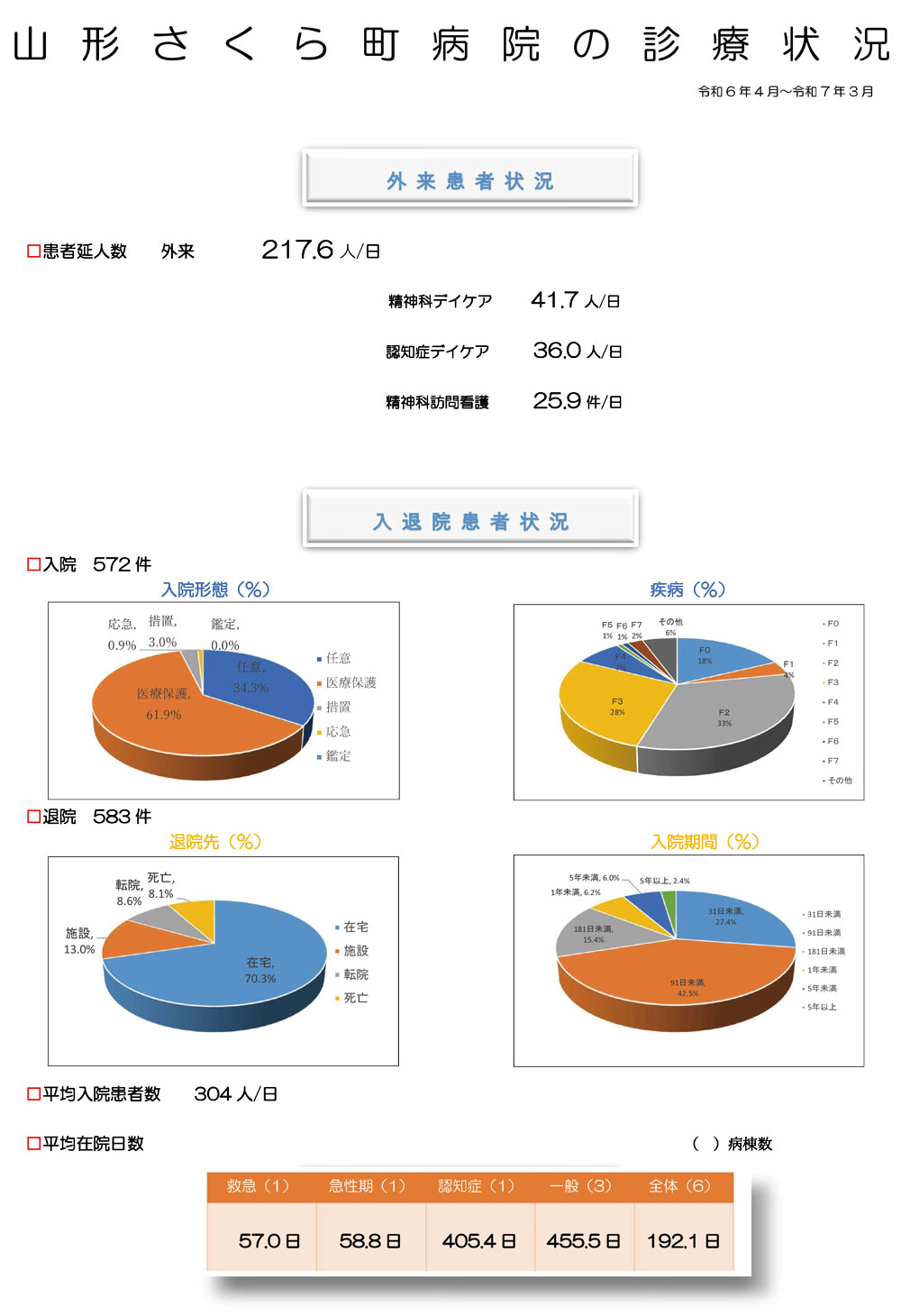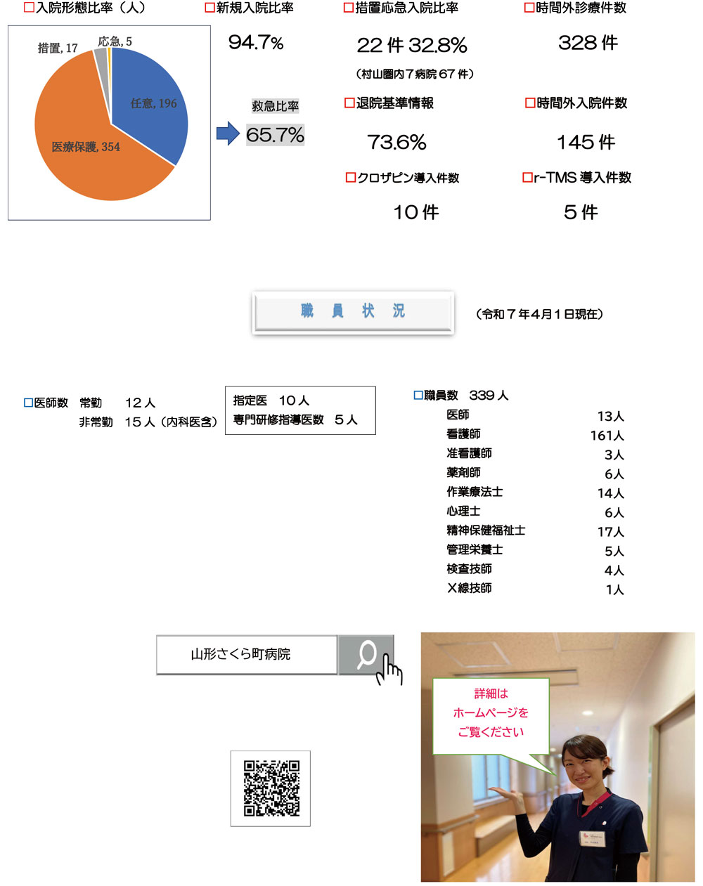 病棟機能としては精神科救急急性期医療入院料病棟(スーパー救急病棟)48床、精神科急性期治療病棟を60床有しており、24時間365日体制で精神科救急対応に取り組んでおります。さらに、山形県応急入院輪番制参加病院に参加しております。その他、認知症治療病棟、(短期)社会復帰リハビリ病棟、身体疾患ケア病棟を有し、計339床の病院になります。また各病棟とも機能別に特徴を持っており、急性期から回復期、慢性期までの全てのケースを有し、チーム医療と、患者さまへ症状に合わせたプログラムを作成し、オーダーメイドの治療を行っております。